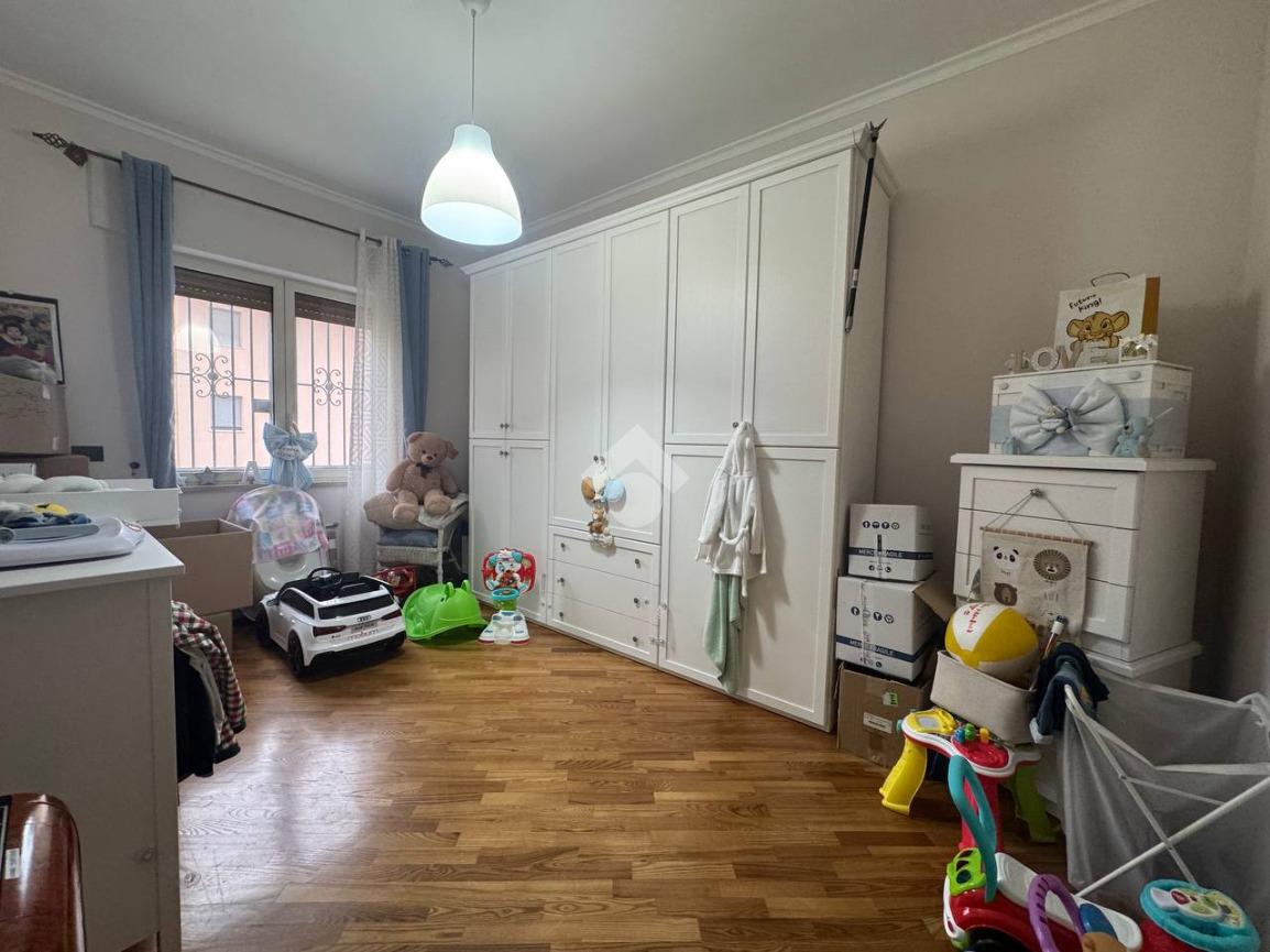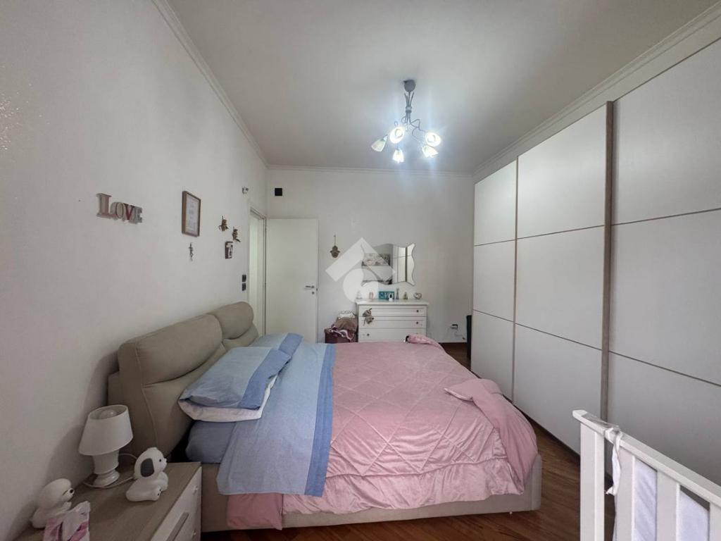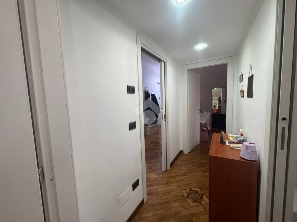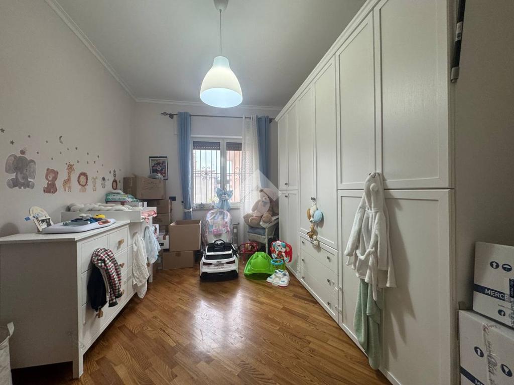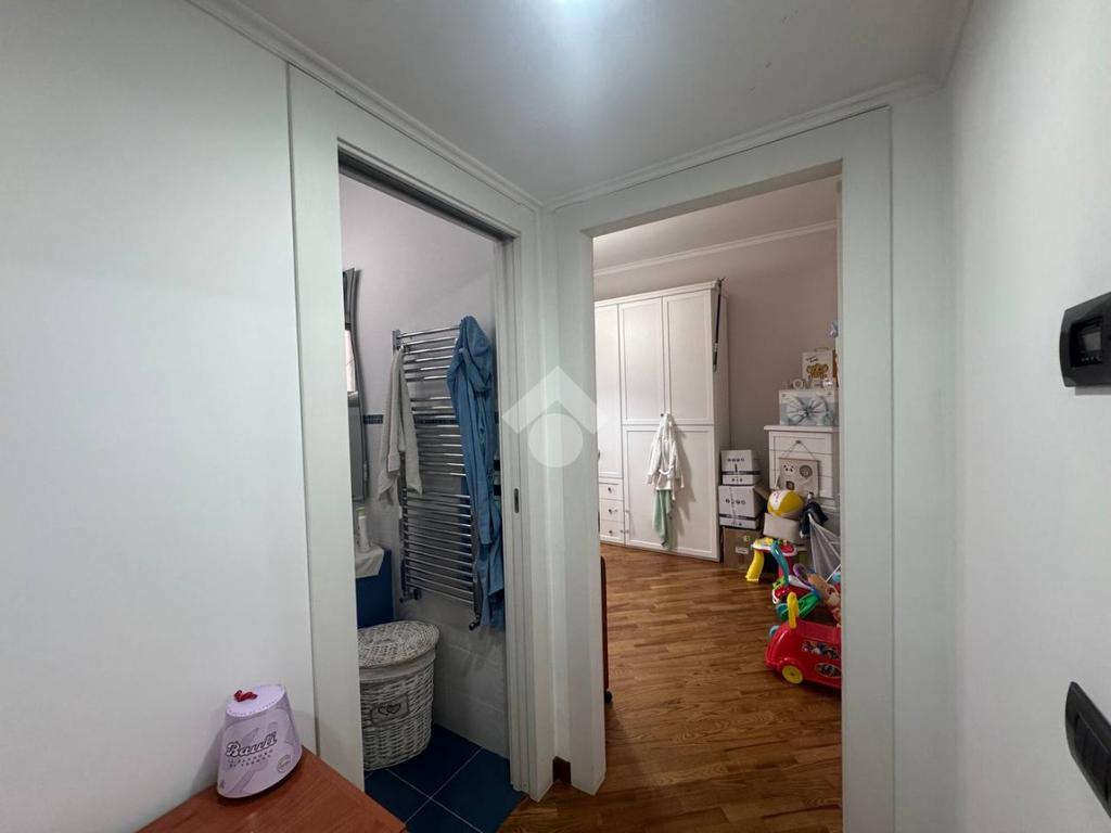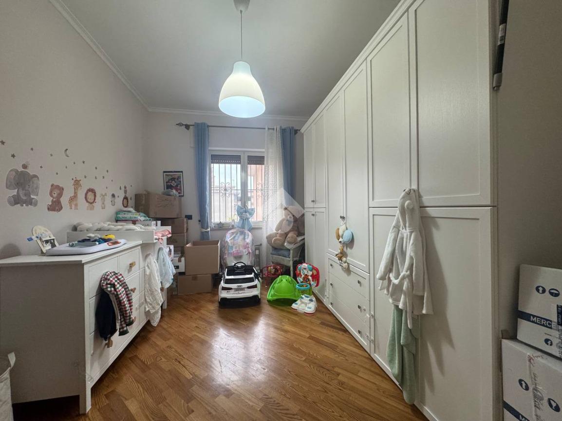 L’appartamento si apre su un ampio salone living con cucina a vista e parquet, luminoso e accogliente, con accesso al primo dei due balconi terrazzati. La zona notte è composta da due camere da letto e doppi servizi.
